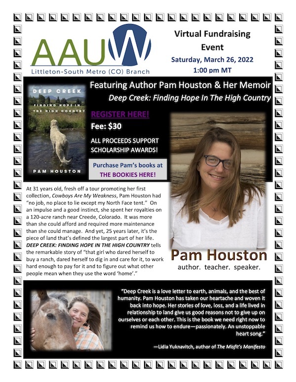 Join the American Association of University Women (AAUW) Littleton-South Metro CO chapter for a presentation by Creede, Colorado author Pam Houston on Saturday, March 26 at 1:00 PM MT online.